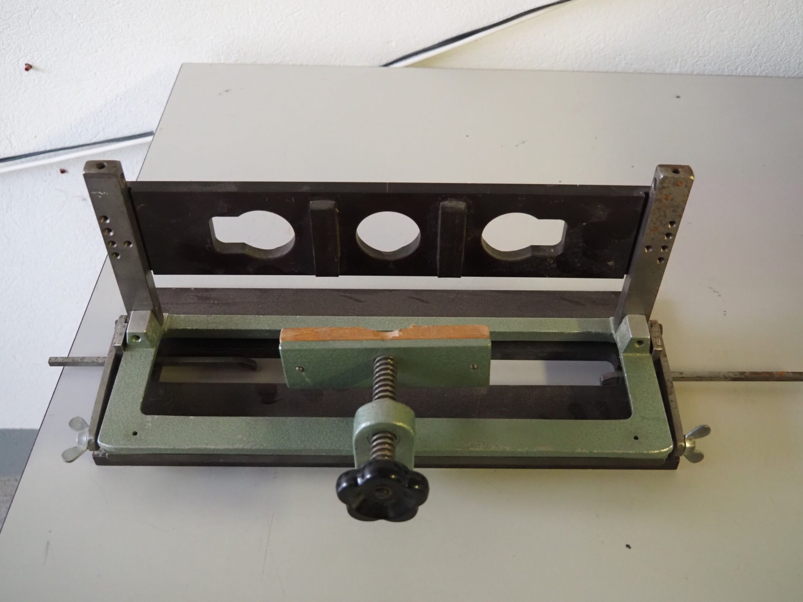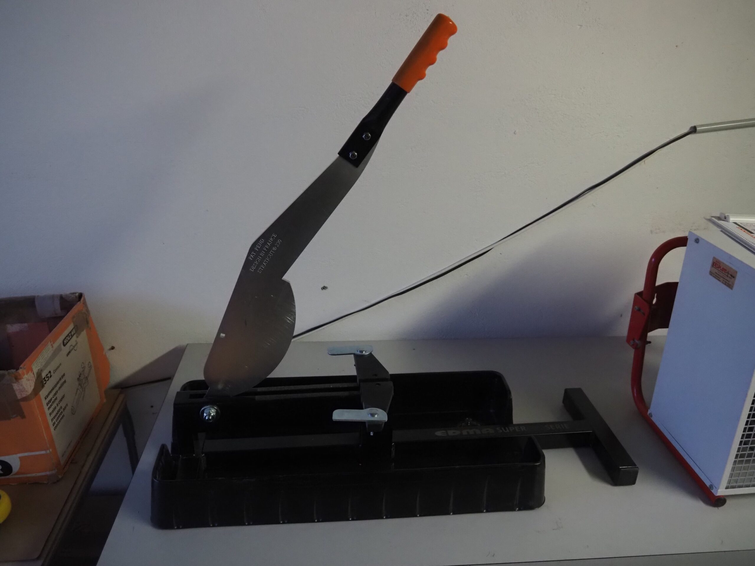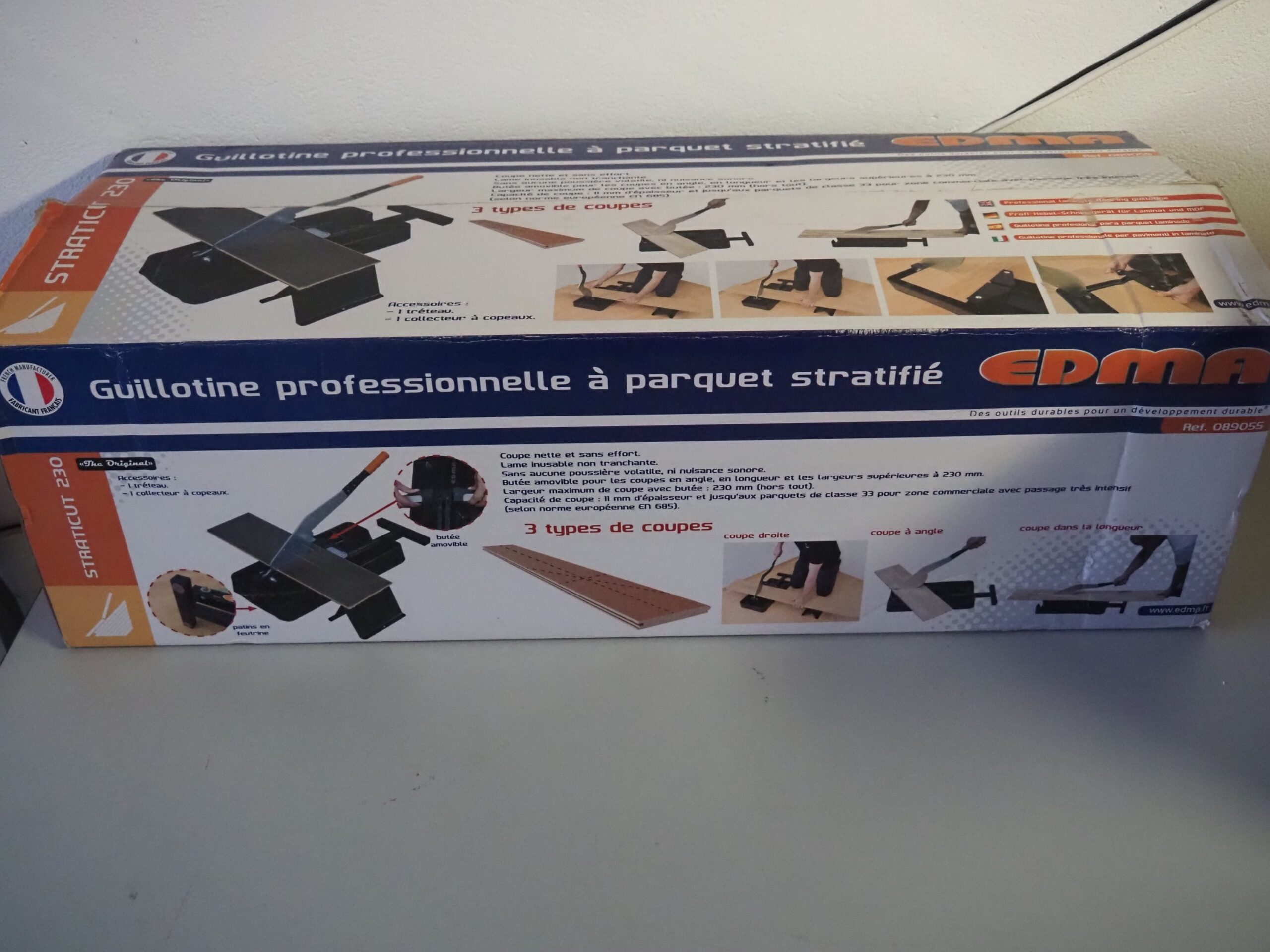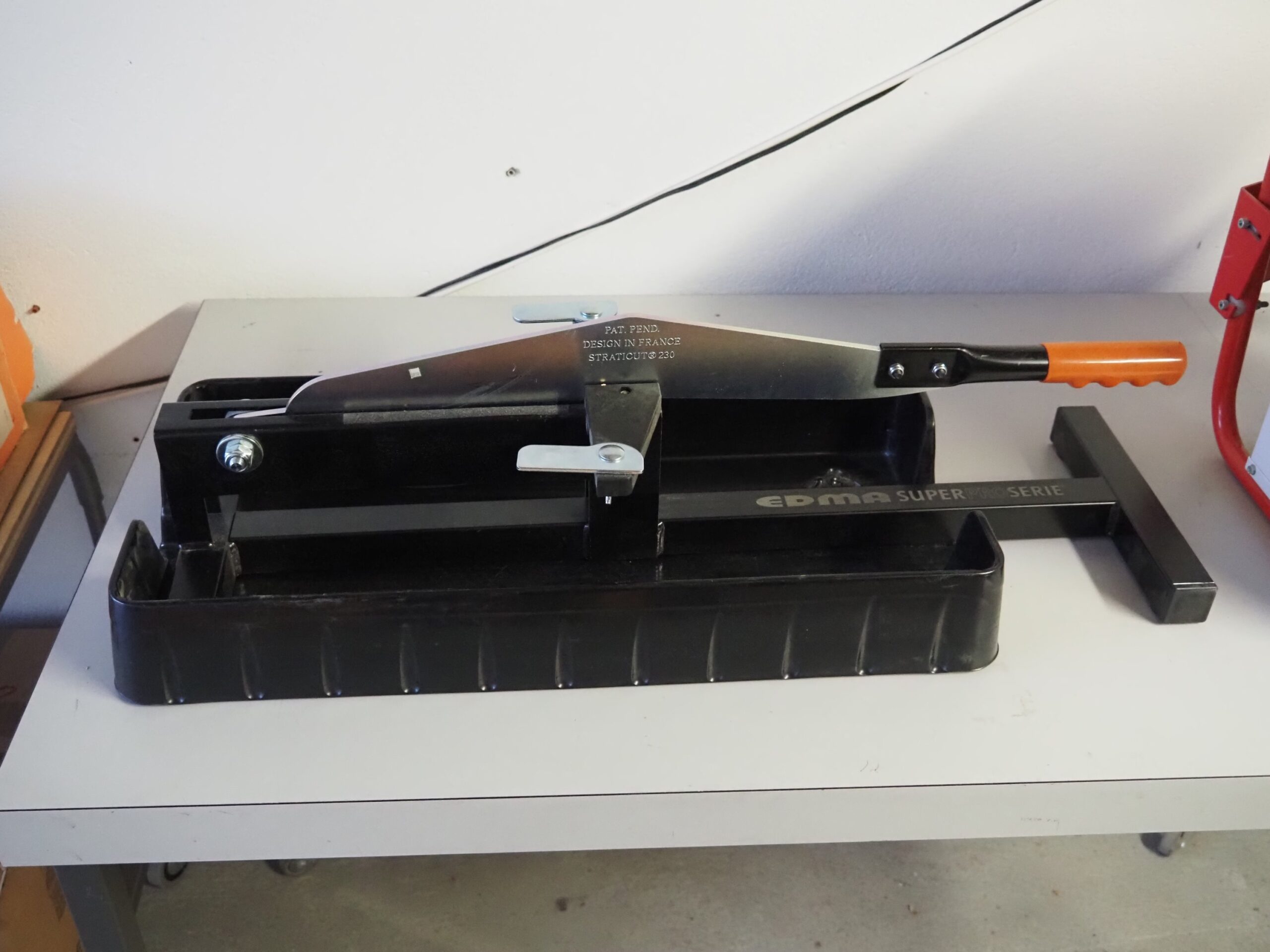 Appareil de coupe EDMA / Guillotine pour parquet stratifié – Coupes droites et coupes en biais – Butée amovible pour les coupes biaises – Largeur max. de coupe avec butée 230 mm – Capacité de coupe 11 mm – 72 x 26 cm – Fr. 50.00