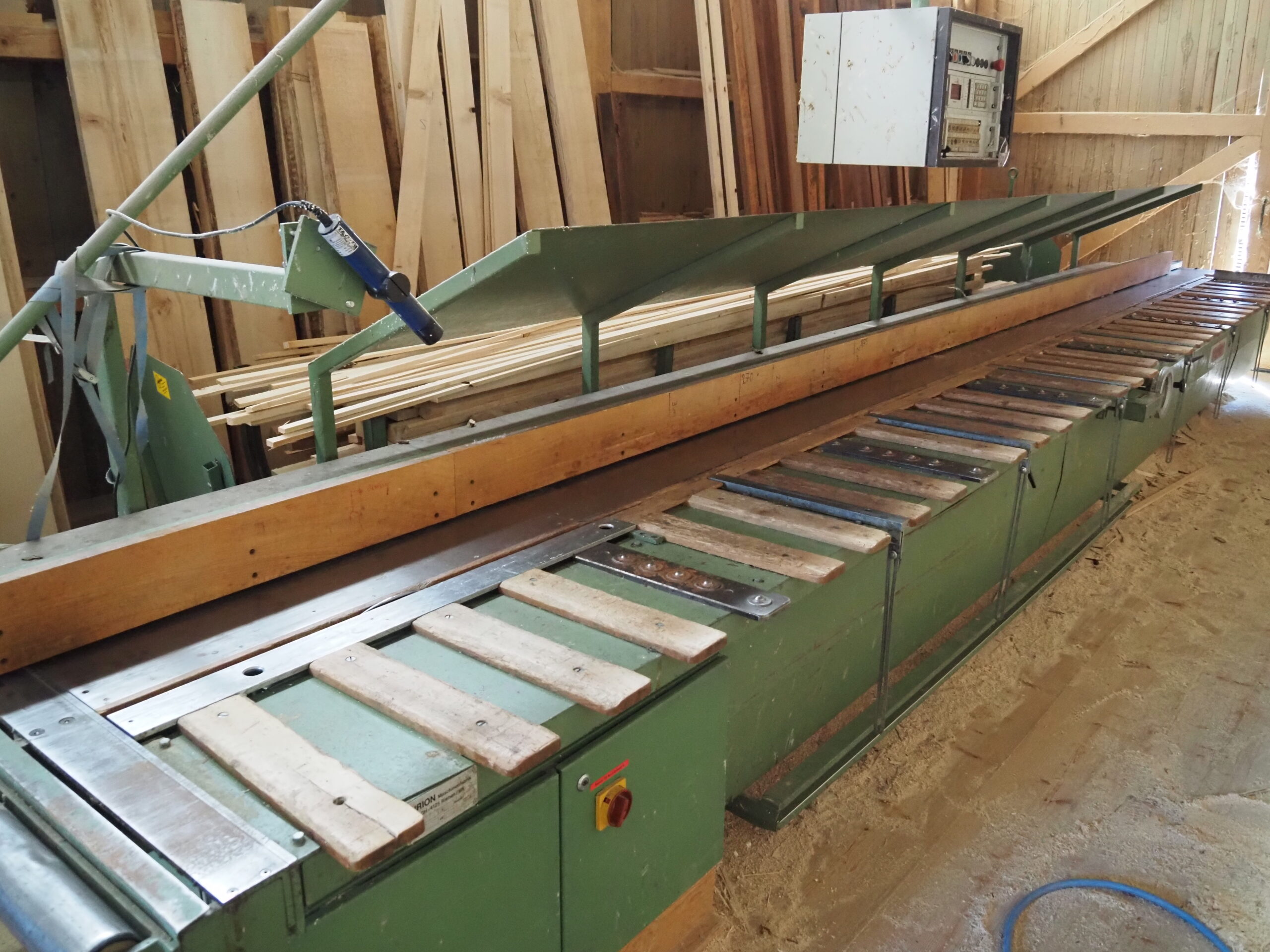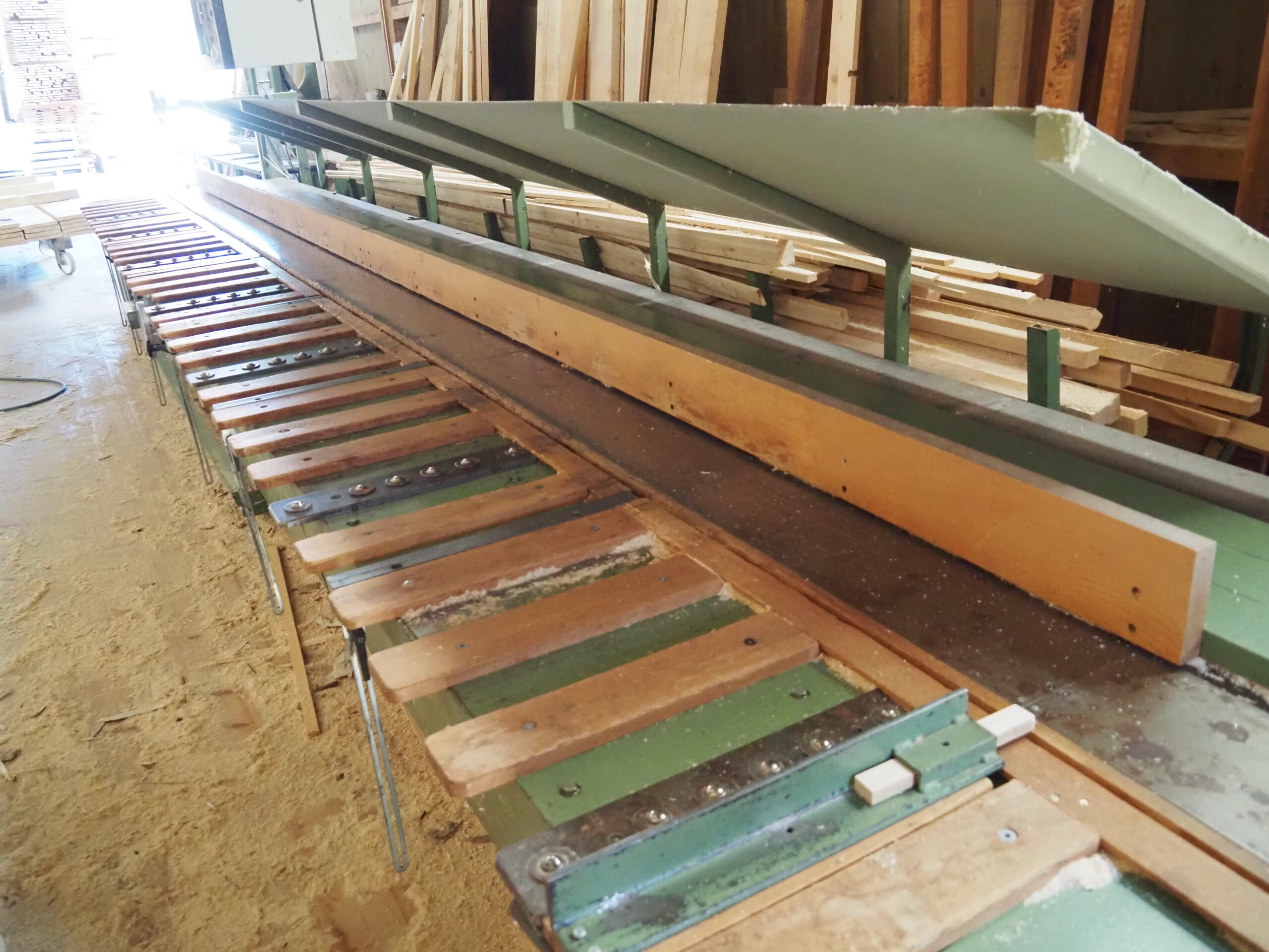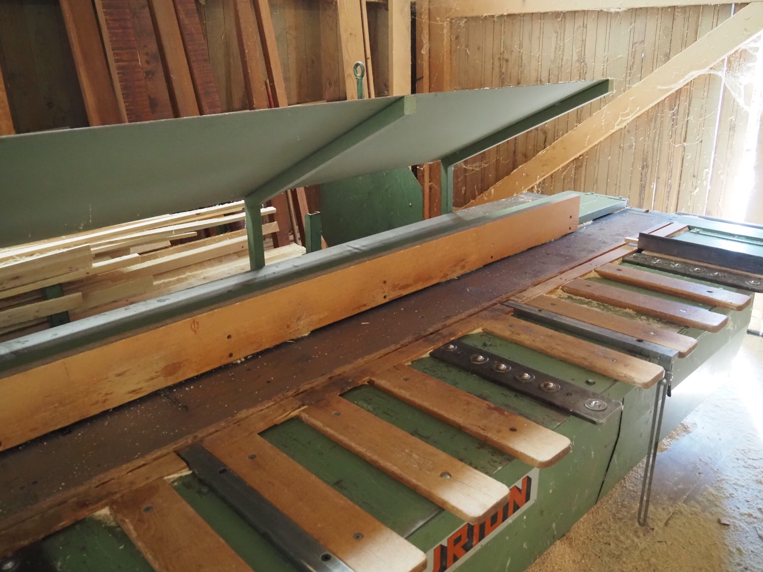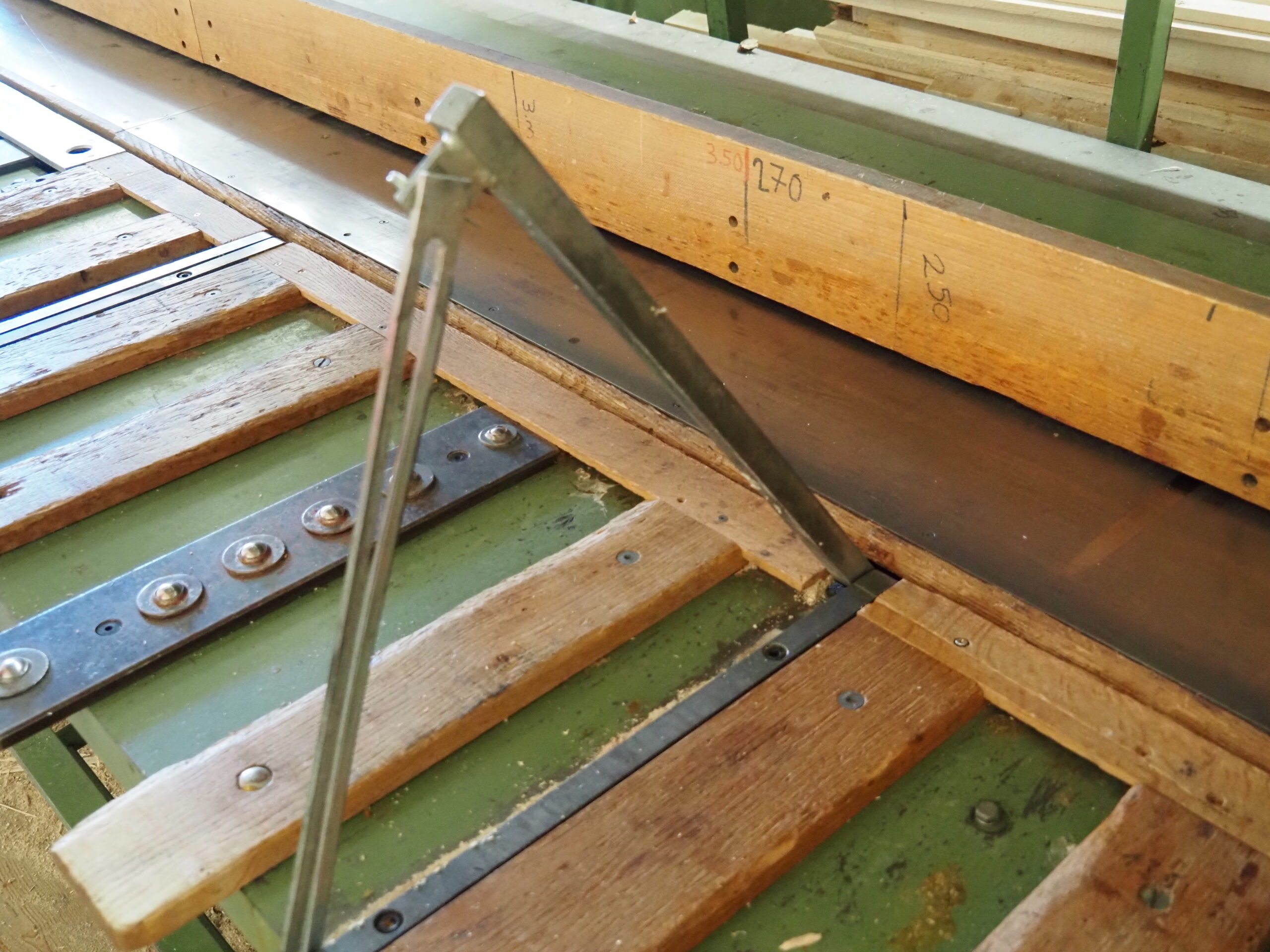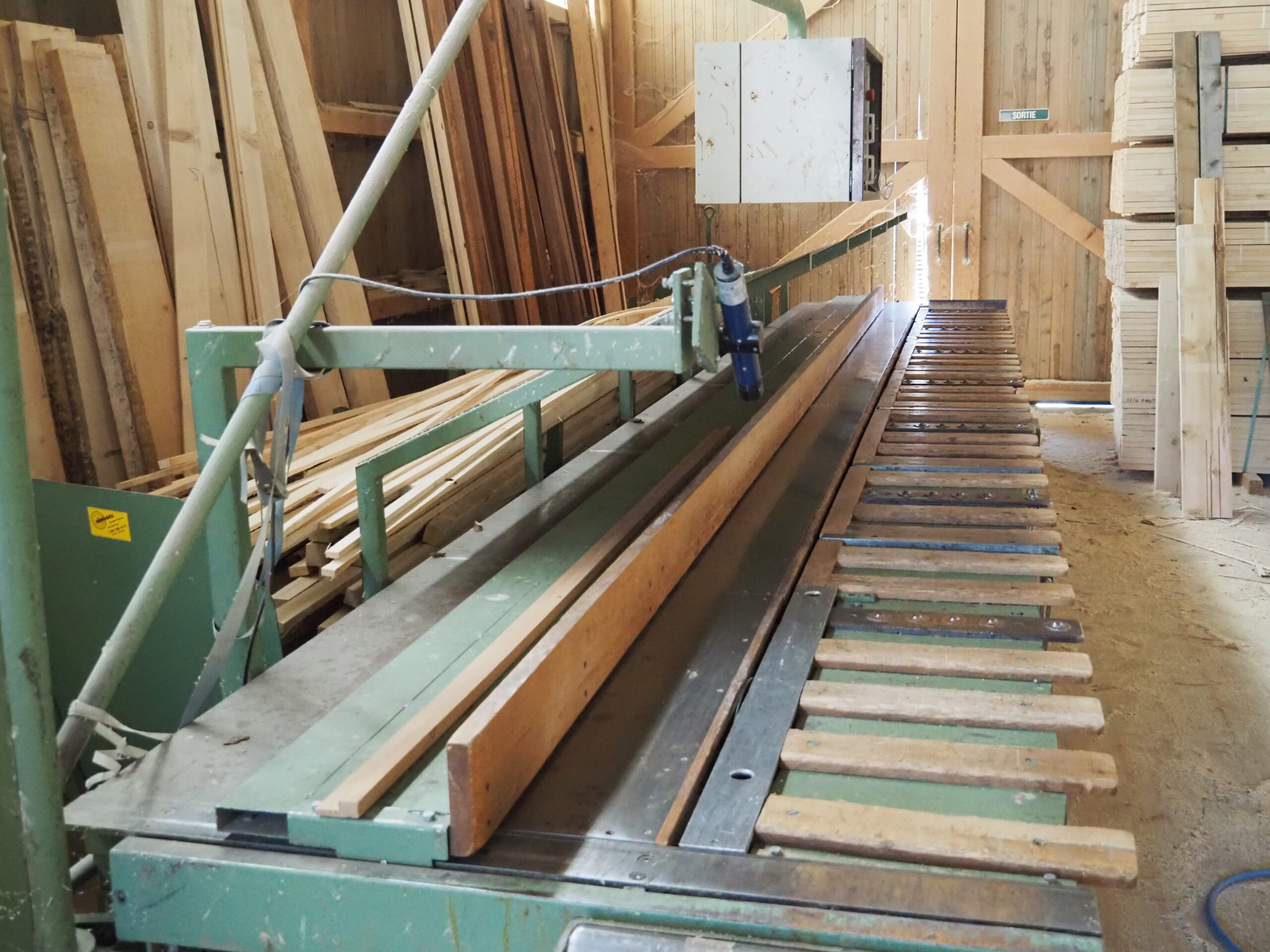 6x fausse-équerres pour coupes de pièces en biais (chanlattes, etc.) – Plan incliné pour évacuation manuelle des délignures – Avance de coupe par barre-pédale