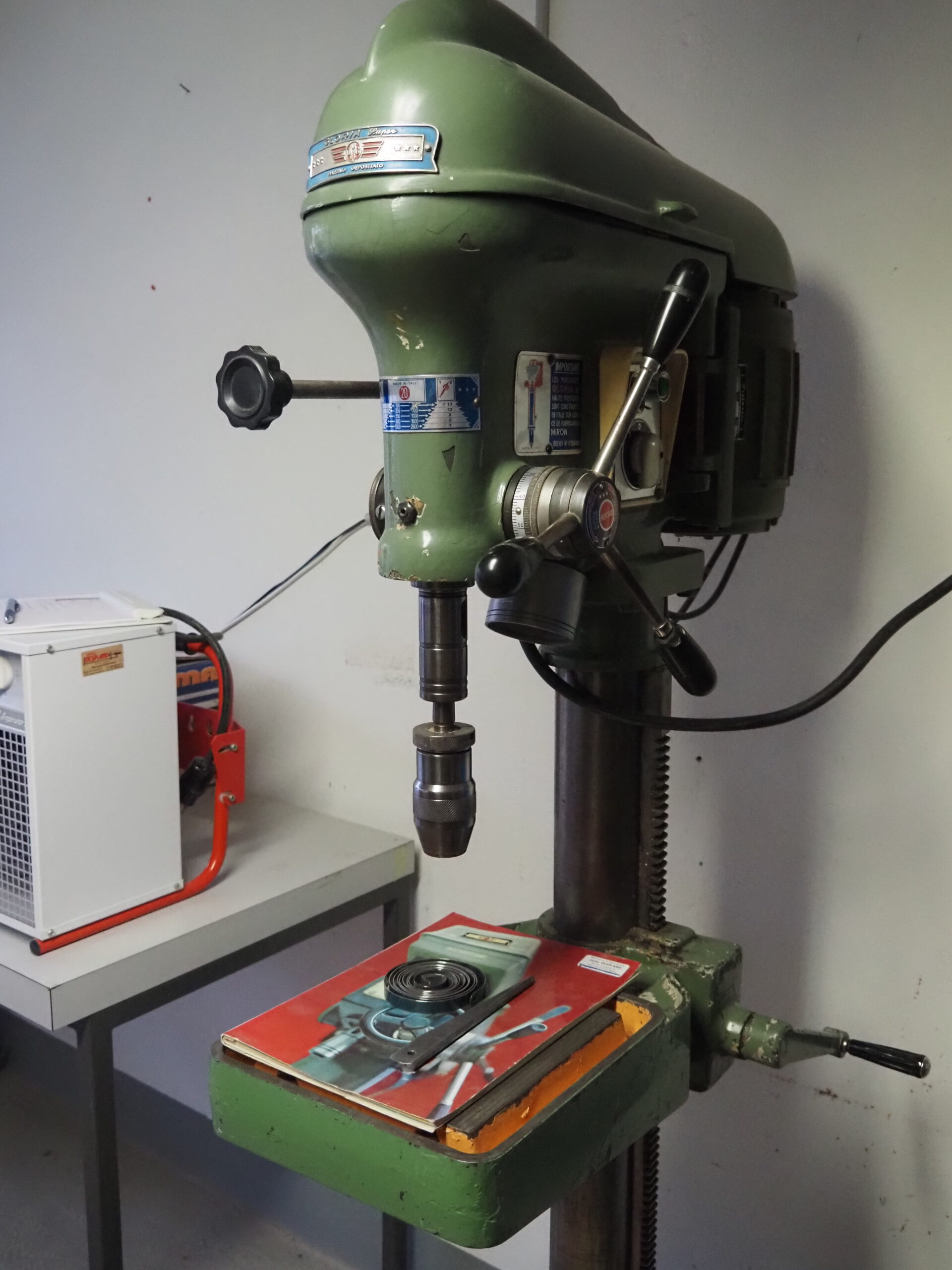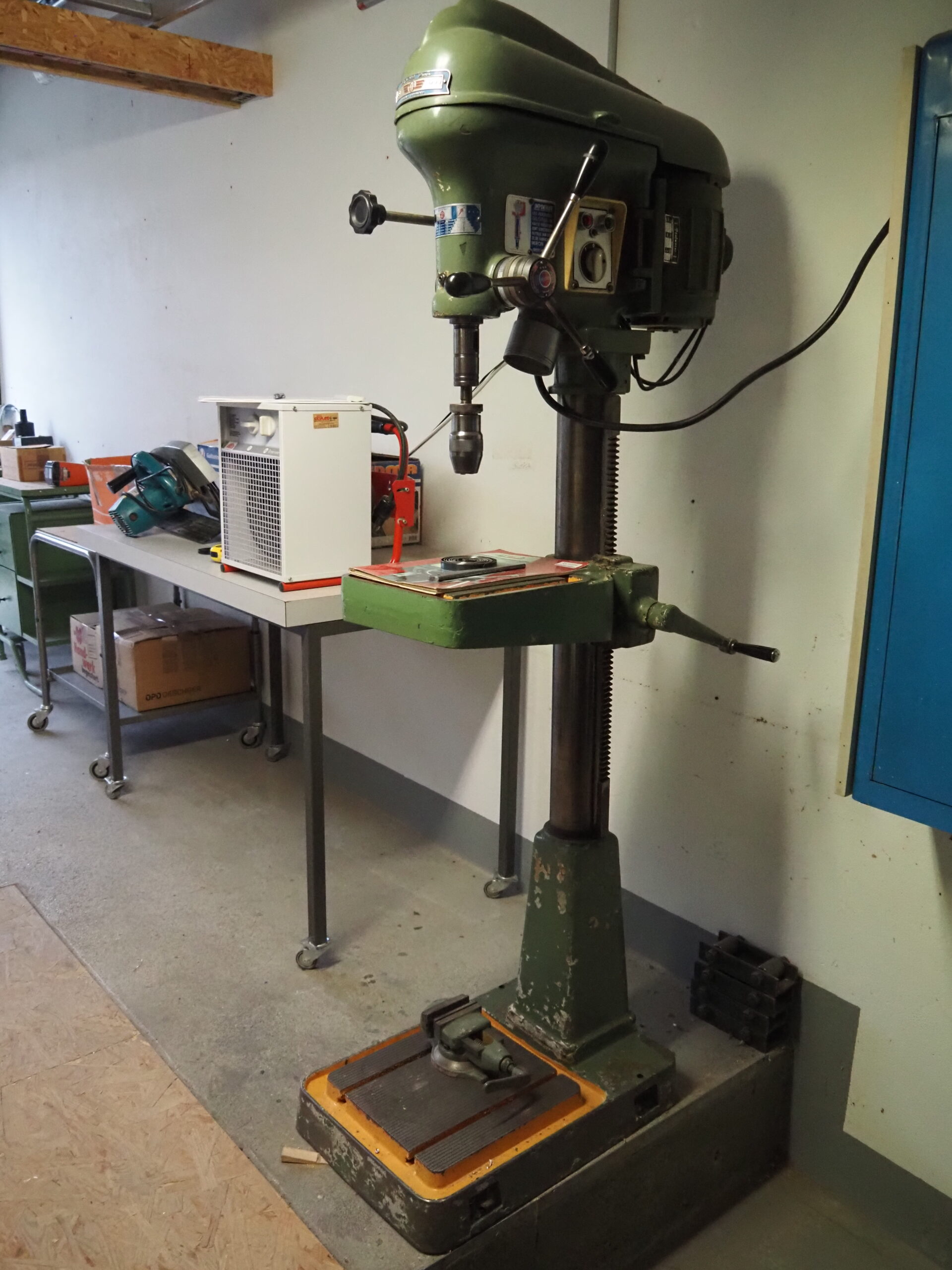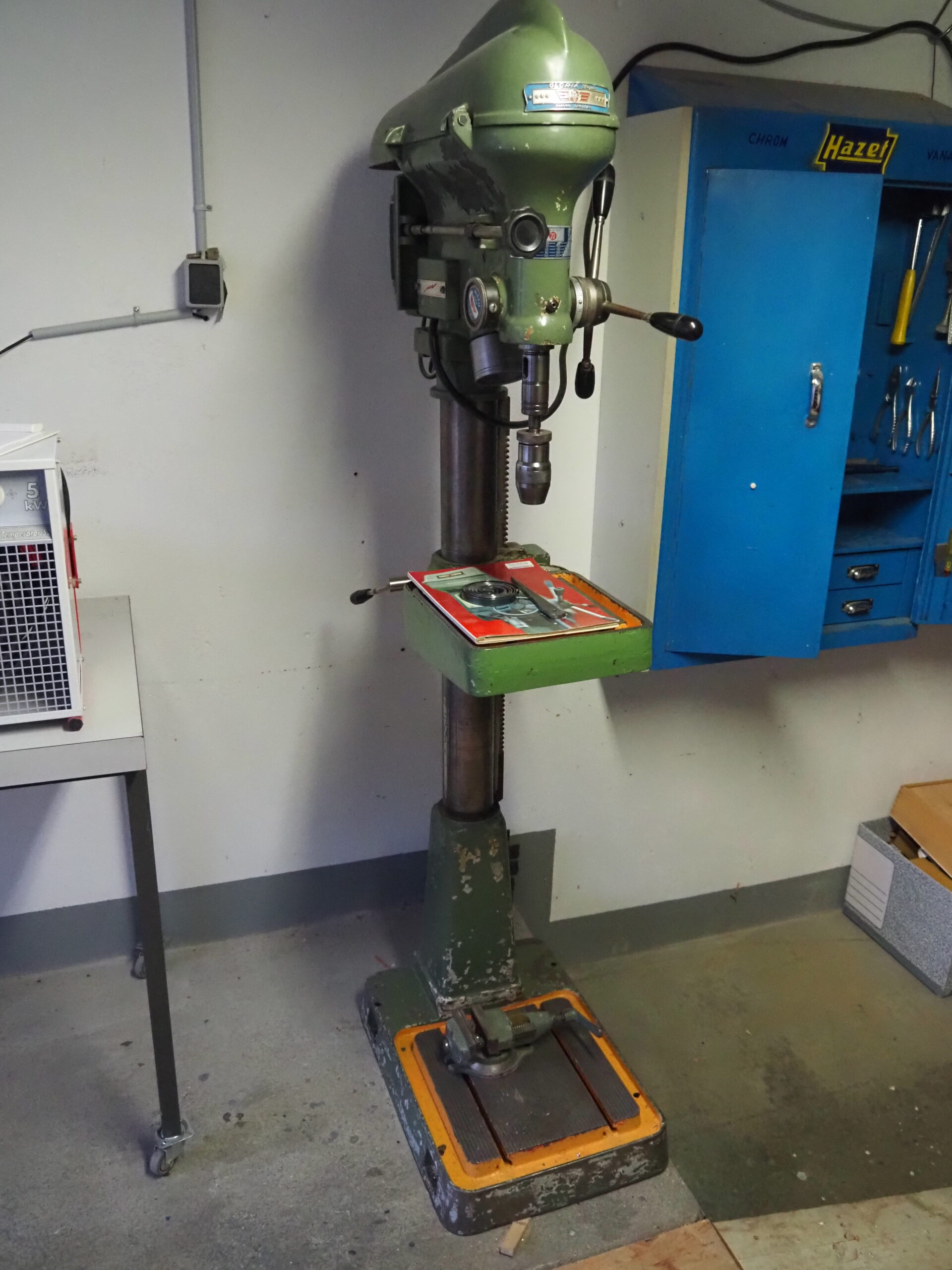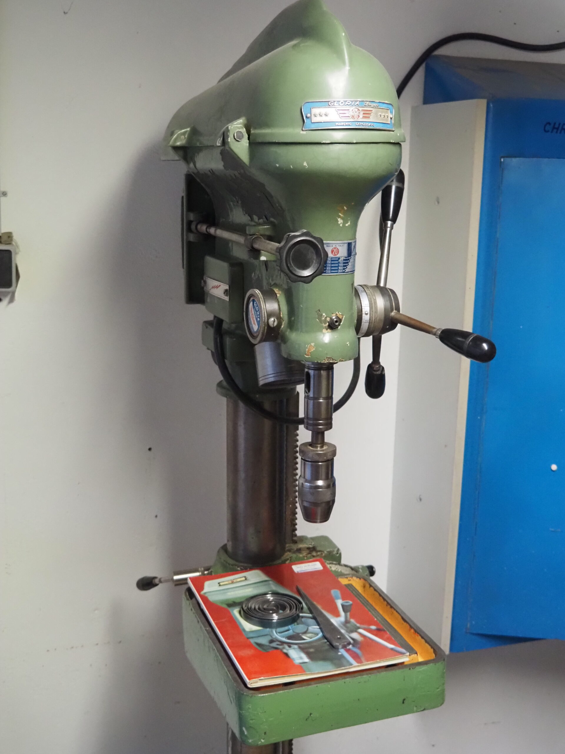 Perceuse à colonne sur pied GLORIA Col de cygne 210 mm – Course 90 mm – Cône CM2 16 vitesses – Interrupteur à 2 vitesses lent-/rapide Avec Etau – 380/400 volts en bon état technique, machine soignée