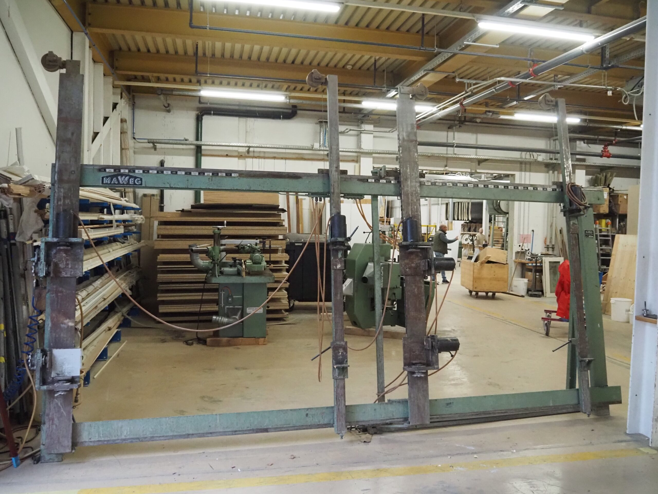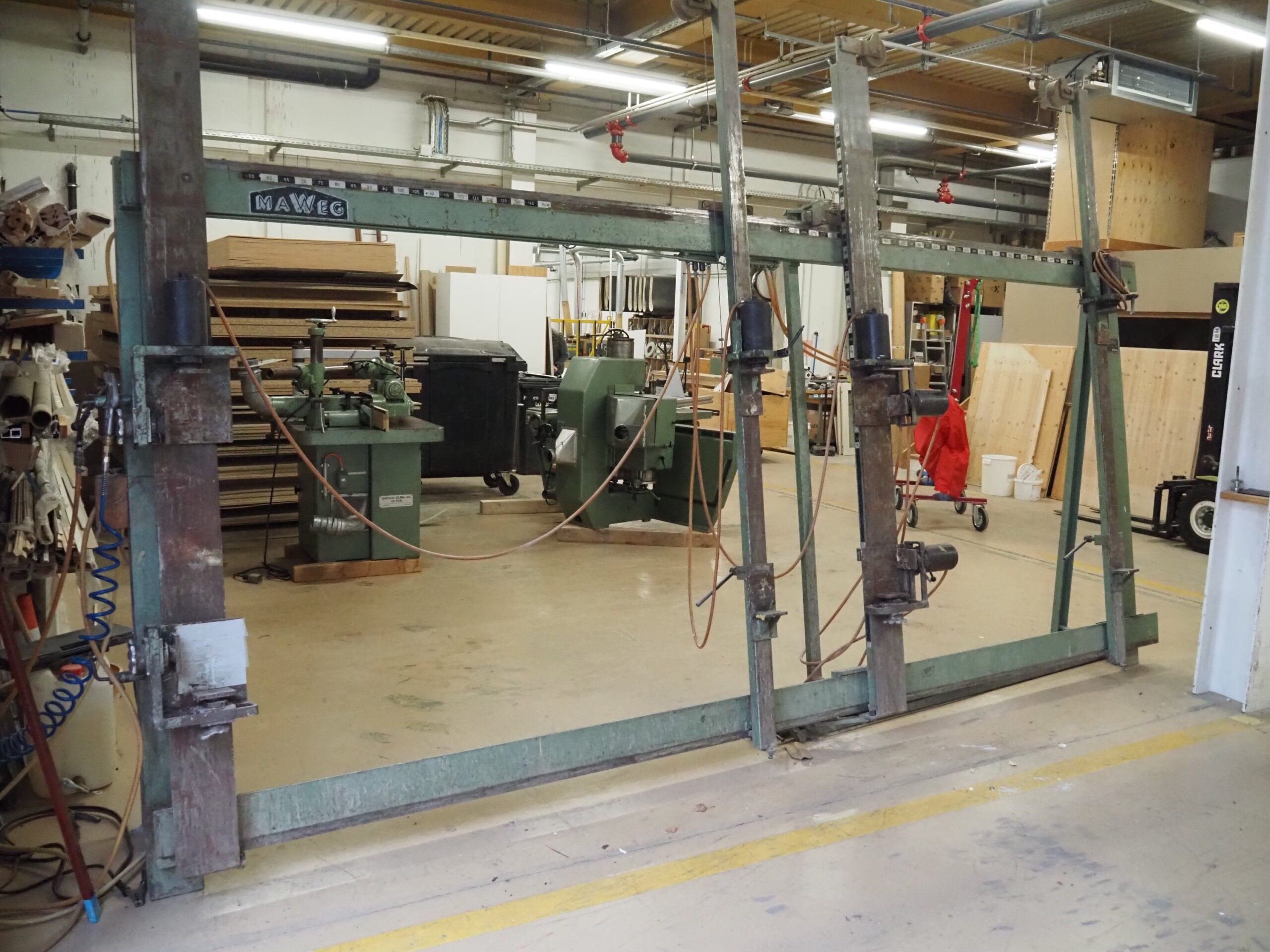 Presse à cadre MAWEG Presse pneumatique – Serrage de 450 x 245 cm – 4x vérins verticaux et 2x vérins horizontaux Dimensions ext. 490 x 288 cm