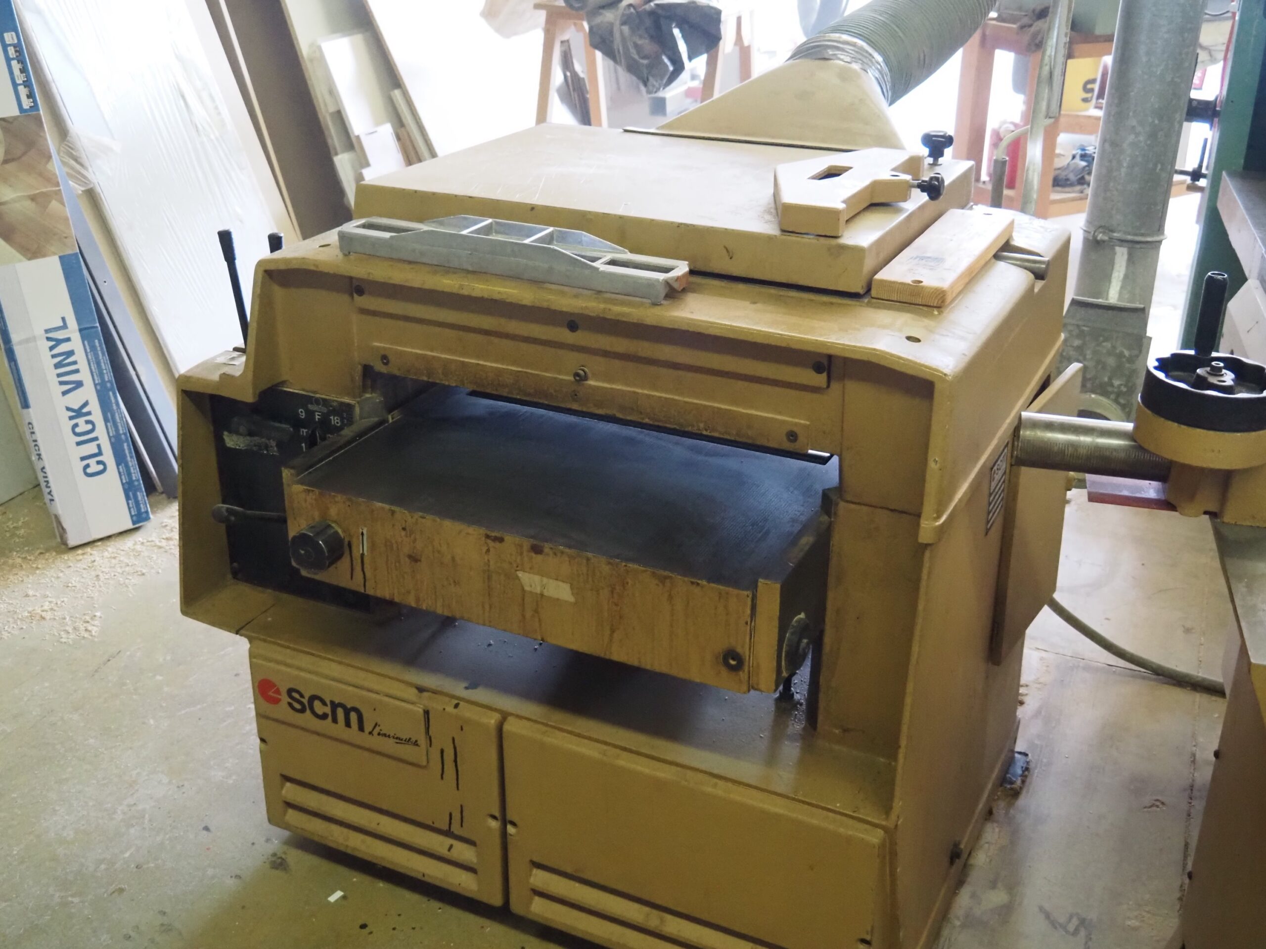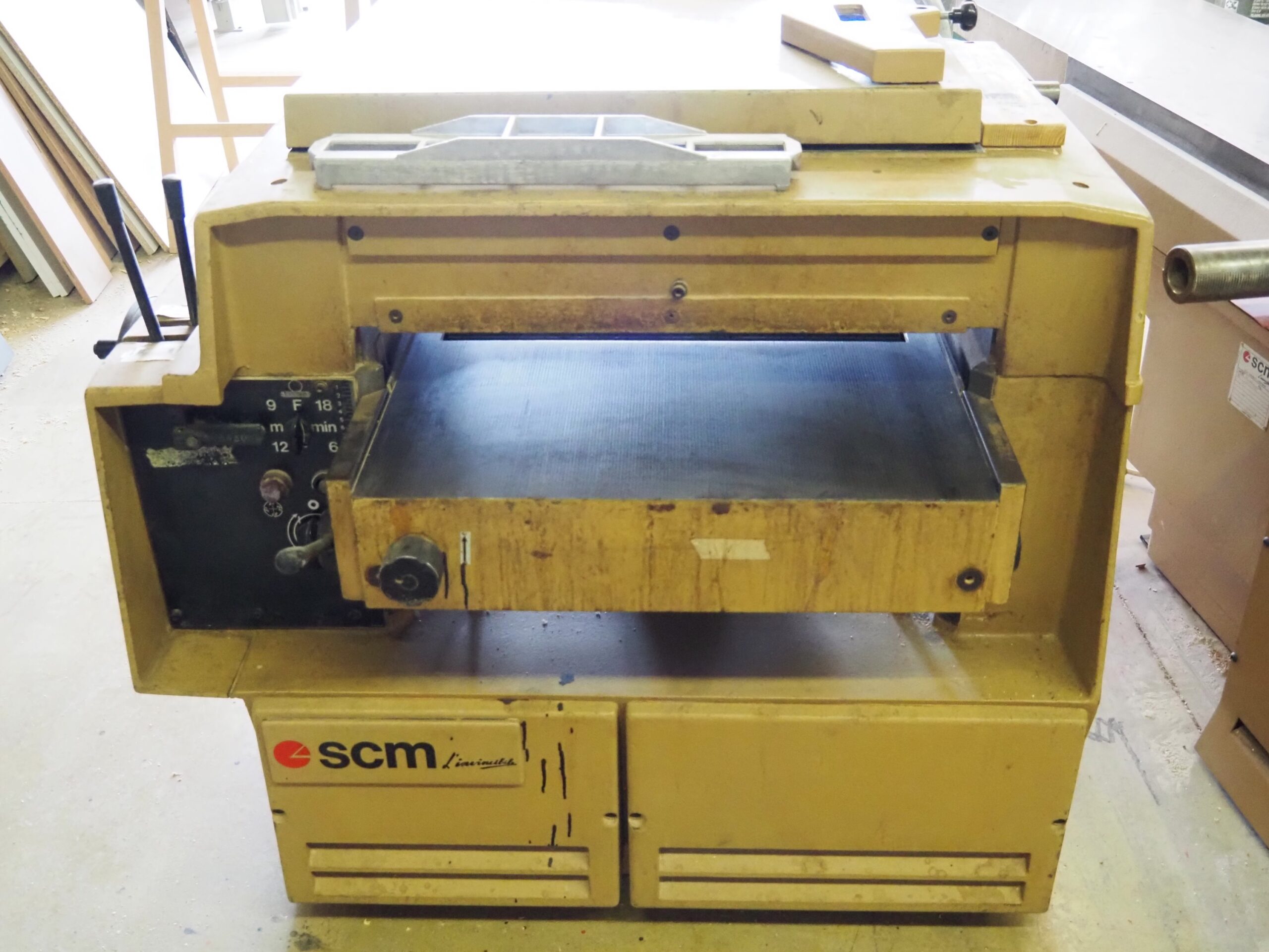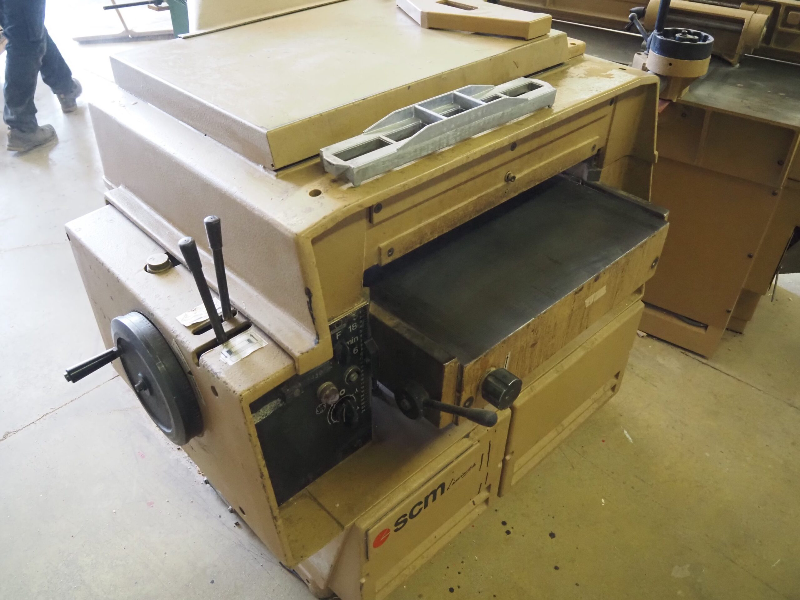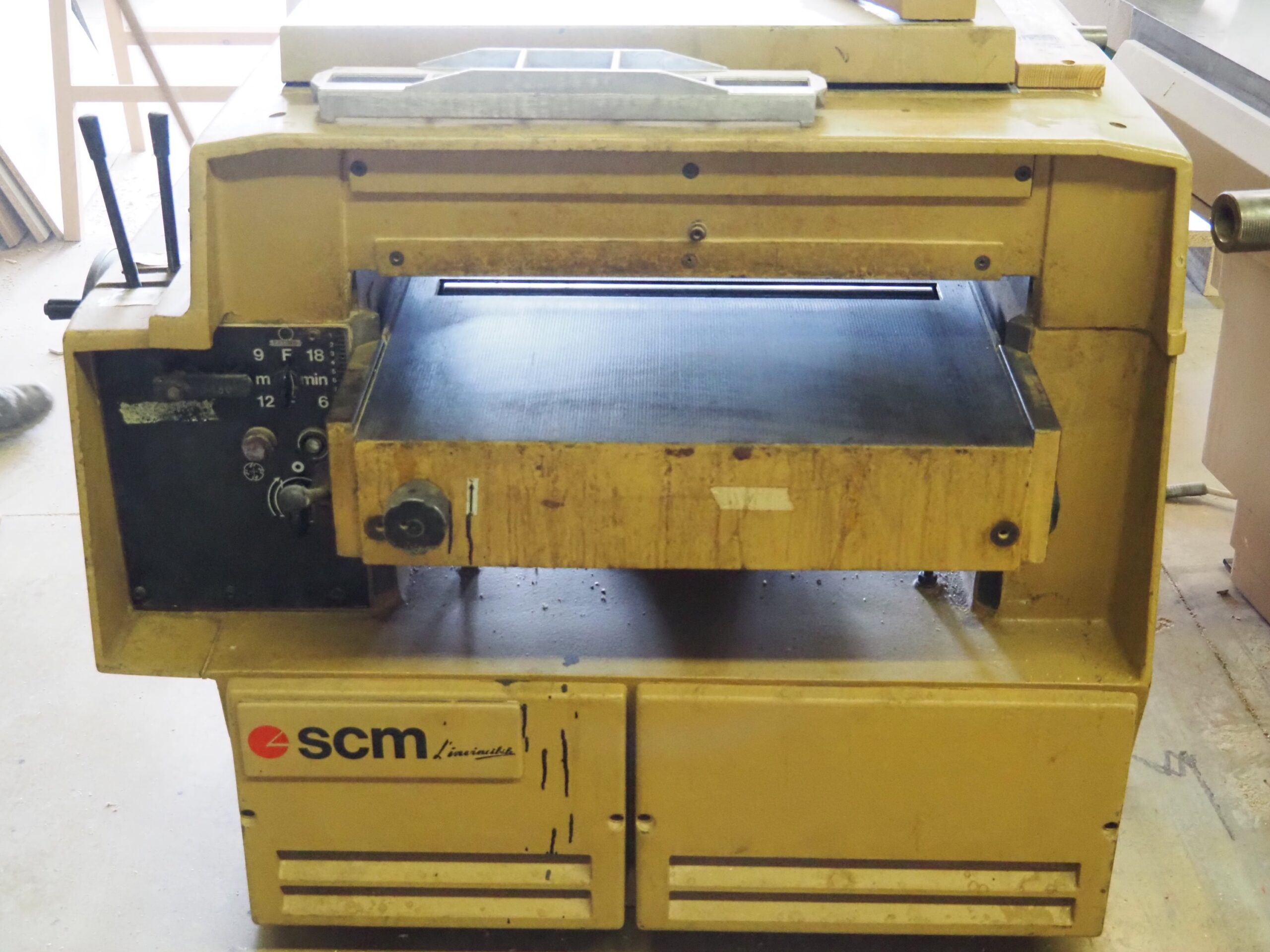 Raboteuse-Tireuse d’épaisseur SCM S63 Capacités de coupe largeur 63 cm x haut. 23 cm 4x couteaux à affûter Table 63 x 103 cm Dimensions 136 x 124 cm – 1050 kg Moteur 400 volts – 5.5 kW En bon état technique