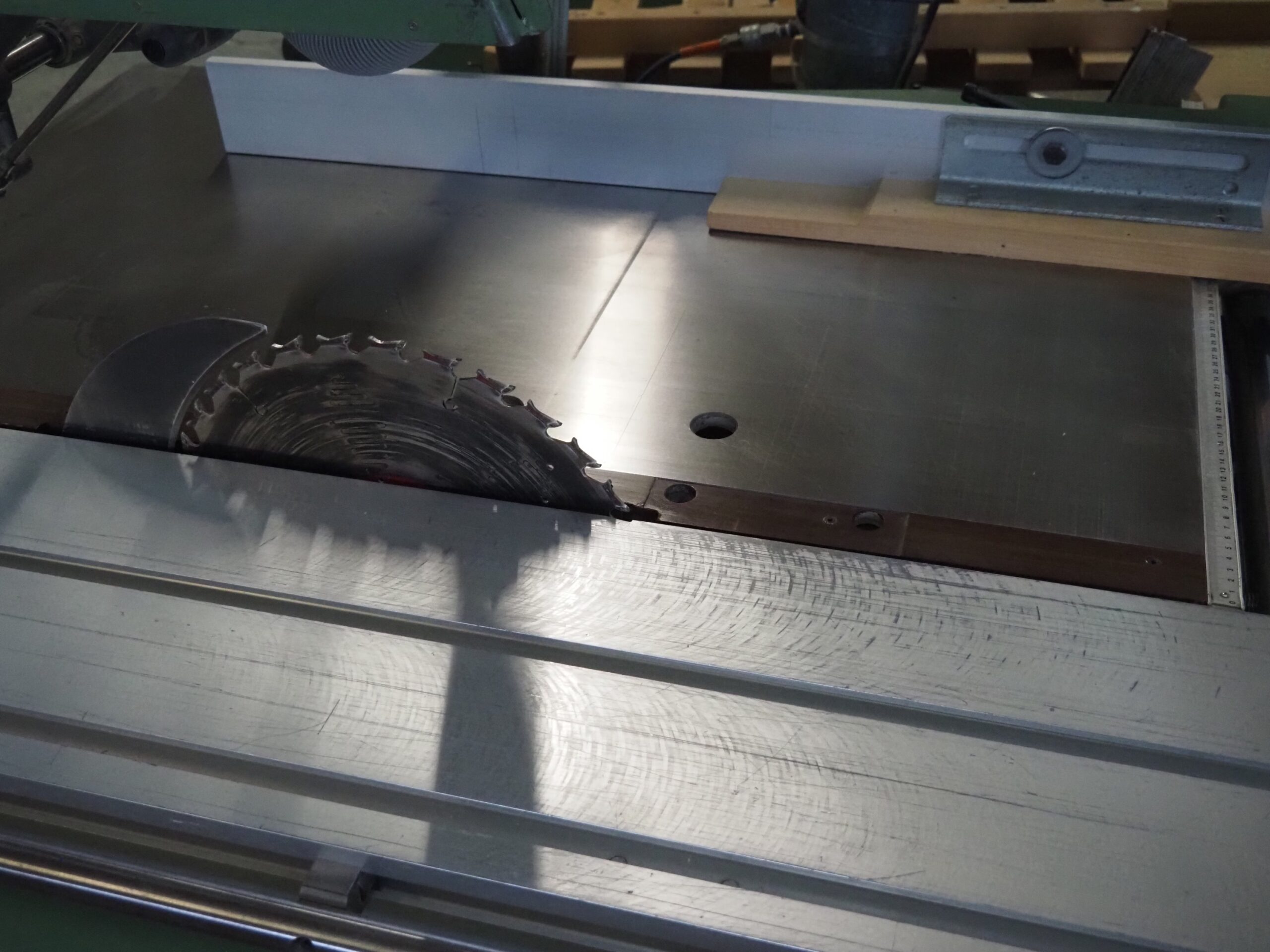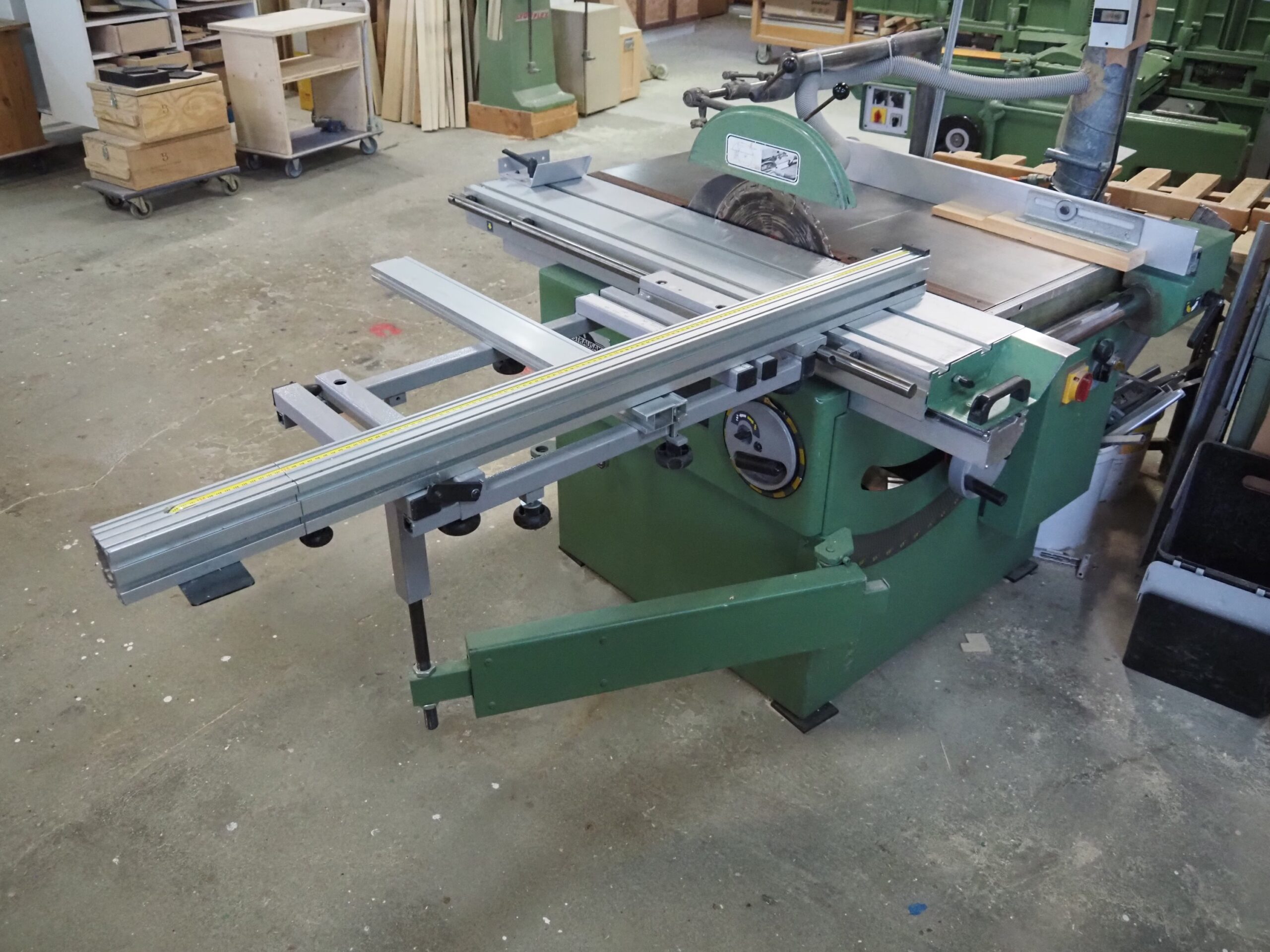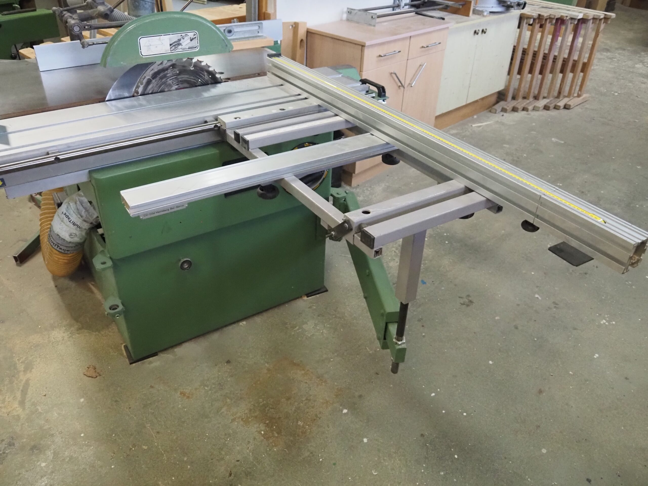 Scie 120 x 145 cm (sans le chariot) – 250 x 145 (avec le chariot)  – Poids 370 kg – 380/400 volts – 5 kW – 9A